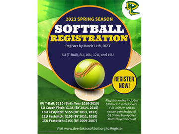 to register. Or, click the "Register" button in the top-right corner of the DL Softball home page. Registration closes on March 11, 2023. Also, be on the lookout for dates, times, and locations of uniform fitting sessions and free clinics for new and returning players!